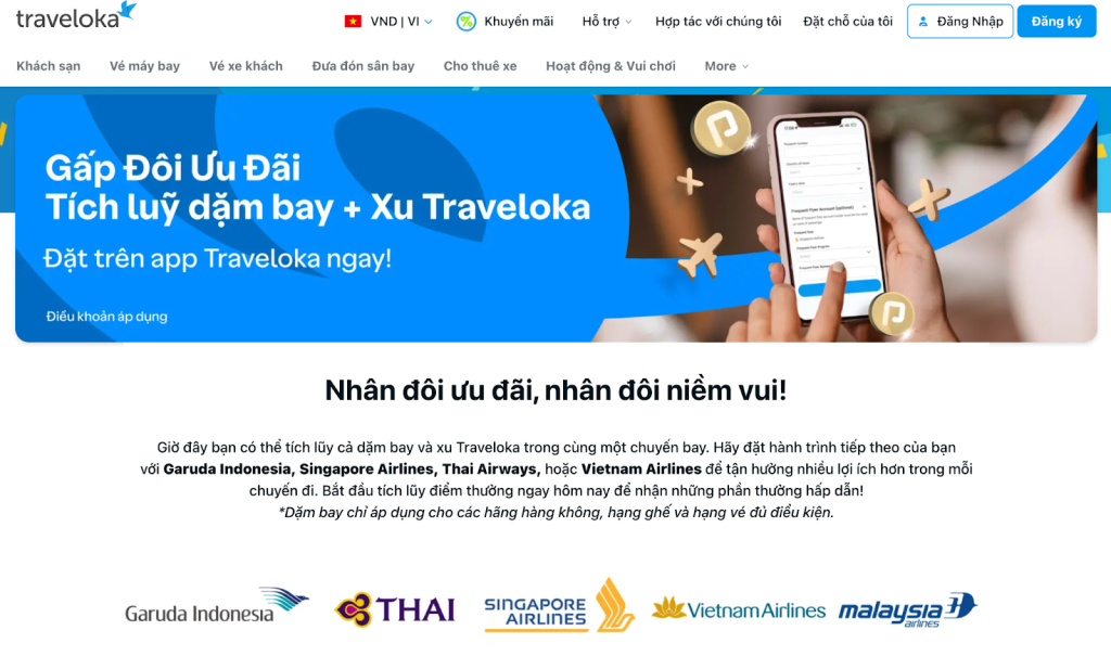 Traveloka là nền tảng du lịch hàng đầu Đông Nam Á, mang đến cho người dùng một phương tiện đặt chỗ toàn diện, tiện lợi và đáng tin cậy. Tại Traveloka, bạn có thể dễ dàng tìm kiếm và đặt vé máy bay, xe buýt, tàu hỏa; lựa chọn chỗ ở từ khách sạn, homestay đến biệt thự; đồng thời khám phá các hoạt động địa phương như tour, công viên giải trí, hoặc dịch vụ đưa đón sân bay.