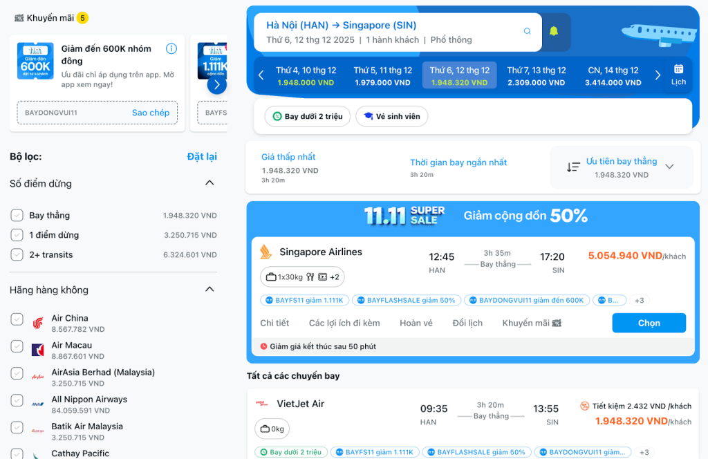 Kinh nghiệm của nhiều tín đồ du lịch cho thấy, mua vé máy bay đi Singapore online trong khung giờ vàng, thường từ nửa đêm đến 2 giờ sáng hoặc đầu giờ sáng, sẽ giúp bạn dễ dàng săn được mức giá tốt nhất. Các nền tảng như Traveloka thường mở cổng ưu đãi vào thời điểm này, với số lượng vé giới hạn nên tốc độ quyết định là yếu tố cực kỳ quan trọng.